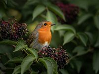 Een mooi roodborstje gluurt brutaal uit een vlierstruik. Het groen van de bladeren vormt een mooi contrast met het kleurrijke verenkleed van het betoverende roodborstje. In veel culturen wordt het roodborstje beschouwd als een geluksbrenger die een nieuw begin en leven symboliseert.
