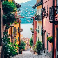 Een schilderachtig pad slingert door een labyrint van kleurrijke huizen waarvan de gevels in warme tinten oplichten. Weelderige planten sieren ramen en balkons, terwijl de zachte golven van een glinsterend meer aan de horizon lonken. De sfeer is kalm en uitnodigend, perfect voor een ontspannen wandeling in deze charmante buurt.