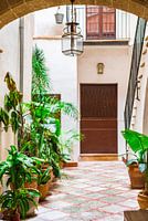 Mooie mening van een typisch Spaanse achtertuinpatio, Mallorca, Balearen, Balearenzee, Middellandse Zee, Spanje
