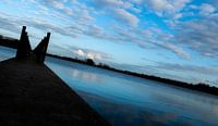 Vanuit een betonnen bunker kijk je uit over een betonnen vlonder wat uitloopt in een grote waterpartij. Dit tekent mooi af met deze prachtige wolkenlucht. Foto gemaakt in Nederland.