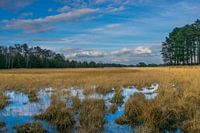 Mooi geel grasveld met reflectie in het water langs de hei. Mooie blauwe lucht met wolken.