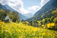 Mooie Marienkapelle in Gerstruben am Trettachtal in de lente met prachtige bloemen