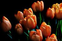 Een boeket van prachtige oranje tulpenbloemen, zijwaarts verlicht, tegen een donkere achtergrond. Kleurrijk stilleven met invloed van de oude meesters.