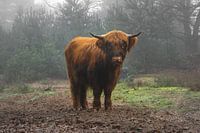 mooie bruine vacht van dit soort koe, de Schotse Hooglander. Mistig en nevelig veld op een winterse dag in het bos