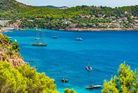 Mooie baai met boten jachten aan kust van Camp de Mar, Mallorca Spanje, Middellandse Zee Balearen