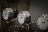 mooie opname van een serie controle apparaten. De meters glimmen mooi in het licht en zijn helder uitleesbaar.