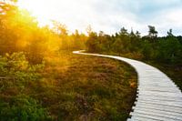 Houten loopbrug in een heidelandschap met zonlicht, De zwarte heide in de Rhön ( Duitsland ) nodigt steeds weer uit tot een wandeling. Achter elke bocht presenteert zich een nieuw landschap. De vegetatie biedt prachtige bomen, planten, dieren, heide en veenogen. Er is veel te zien op de rondwandeling, die in elk jaargetijde de moeite…