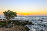 Een Fofoti (mangrove boom) aan de noordkust van Aruba. De zon zinkt weg in zee. Een mooi kleurrijk beeld.