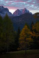In de voorgrond staan een aantal Lariksen in herfstkleur.