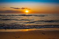 Mooie kleurrijke zonsondergang op het strand van Groote Keeten in Callantsoog te Nederland. De lucht kleurt mooi oranje en het strand licht een beetje op. Met een kalme zee