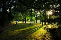 Een landschapsfoto waarbij de zon laag door de bomen schijnt. Deze foto heb ik gemaakt in het park bij mijn huis in Frankrijk. De lange schaduwen van de boomstammen vormen een mooi lijnenspel op het gras. De bladeren en naalden van de bomen vormen een kader om het beeld.