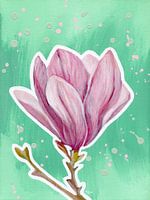 Schilderij van een magnolia in zachte, mooie kleuren met een witte omlijning.