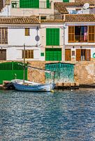 Mooie mening van oude vissersboot die bij de kust van mediterraan dorp op Mallorca, Spanje wordt verankerd