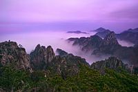 Beeld van een mooi en rustgevend berglandschap in China (Mount Huangshan , Yellow Mountain , Huangshan ) in Zuid-China. Het landschap staat bekend om de vele granieten rotsen die uit een zee van wolken oprijzen en staat op de UNESCO lijst van werelderfgoederen.
