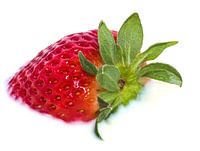 Aardbei close up, fel rood met groen en witte achtergrond.
