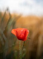 Het zonnetje schijnt op deze felrode klaproos te midden van een graanveld in België. Een klein insect komt net aangevlogen. De zon geeft een mooie warme gouden gloed aan het tafereel. De foto is genomen in Juni op een warme zomerdag. Hang jij deze mooie foto print aan jouw muur?