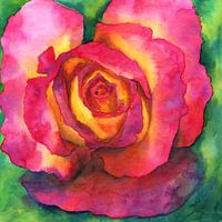 Wie kan een charmante roos weerstaan? Het aquarelschilderij Beautiful Rose toont een edele roos in heldere tinten roze, rood, oranje en geel op een contrasterende, geabstraheerde groene achtergrond. Het is geschilderd in een modern vierkant formaat. 136