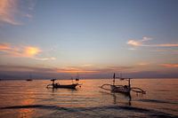Mooie schemering op het strand en silhouet van vissersboot en zeilboot