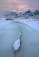 Bevroren riviertje naar het Flakstadpollen fjord met in de achtergrond de mooie bergen bedekt met sneeuw.