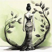 Dit is een digitaal schilderij van een mooie vrouw in een lange jurk omringd door bomen. Een stijlvol schilderij dat rust uitstraalt. Groene, zwarte en witte tinten. Geschikt voor elke ruimte.