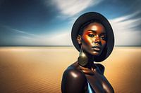 Dit prachtige schilderij toont een jonge zwarte vrouw in een surrealistisch woestijnlandschap, omringd door een uitgestrekte hemel boven haar en glinsterend zand onder haar voeten. Het legt de schoonheid van de natuur en de gratie van de vrouw vast in een adembenemende omgeving.