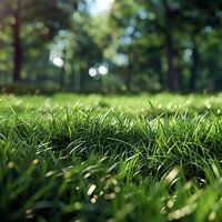 Mooie wazige achtergrondafbeelding van lentenatuur met een netjes getrimd gazon omringd door bomen op een heldere zonnige dag.
