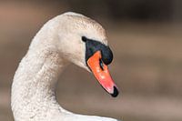 Zeer scherpe foto van een mooie kop van een zwaan. Door het zachte achtergrond komt de kop er mooi uit.