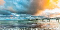 Op het strand van Kellenhusen , vlakbij de populaire pier , drijft de wind de wolken voor zich uit .