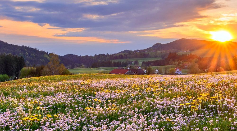 Schilderachtige romantische zonsondergang met kleurig bloeiende bloemen op een sfeervolle avond in het voorjaar. Allgäu, Beieren, Duitsland, Europa