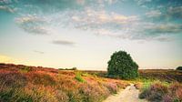 De Mookerheide, badend in het avondlicht van de laagstaande zon. In augustus begint de bloei van de heide en kleurt deze in prachtige tinten paars. Deze tint wordt nog verterkt door het gouden licht in het uurtje voor zonsondergang. De Mookerheide of Mookerhei is een bos- en heidegebied ten oosten van Mook in de Nederlandse provincie Limburg op een hoogte van ca. 50 meter, ten zuiden van Nijmegen. Op de Mookerheide vond in 1574 de Slag op de Mookerheide plaats. Lodewijk van Nassau en Hendrik van Nassau, twee jongere broers van Willem van Oranje, vochten hier tijdens de Tachtigjarige Oorlog tegen de Spanjaarden. Het bosgebied tussen Nijmegen en Mook was eerder een grote heide, die in zijn geheel de Mookerheide werd genoemd. Ter hoogte van Molenhoek is de Heumense Schans nog terug te zien in het landschap. Natuurmonumenten bezit in de Mookerheide een gebied van 235 ha.