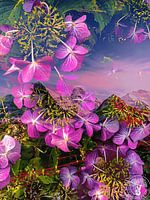 Stel je voor: je staat midden in een zee van paarse hortensia’s, hun bloemblaadjes glanzen zacht in het licht van een opkomende of ondergaande zon. Elk bloemetje lijkt met zorg geplaatst, als penseelstreken op een levend canvas. De kleuren zijn rijk en diep—van lavendel tot indigo—en ze vormen een tapijt van rust en schoonheid.