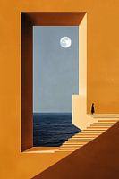 Een minimalistisch en surrealistisch beeld waarin architectuur en natuur samensmelten in een warm mediterraan kleurenpalet. Een monumentale doorgang in okerkleurige muren frames een dramatisch uitzicht op een kalme zee onder een volle maan. Op de voorgrond leiden geometrische trappen naar een kleine solitaire figuur, wat een gevoel van contemplatie en oneindige mogelijkheden oproept.