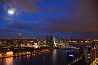 Rotterdam gefotografeerd in de avond vanaf the Red Apple(127M), uitkijkend op de Maastoren(165M), de Rotterdam(151M), Erasmusbrug(139M), Montevideo(140M), en het World Port Center(123M). Verlicht door de Maan met als achtergrond een zacht blauwe hemel en gekleurde wolken.