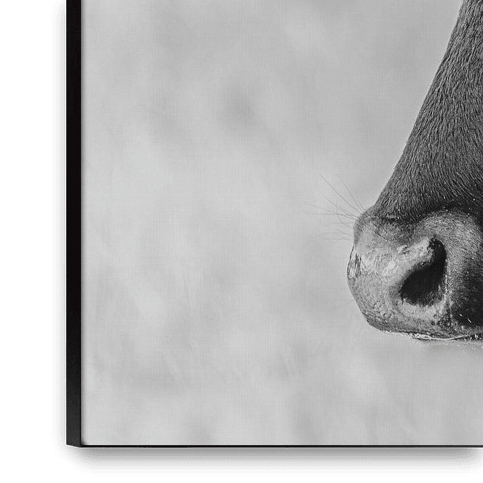 Contrastrijk portret van een koe in zwart/wit.