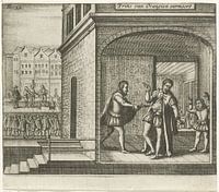 Moord op de prins van Oranje, 1584, anoniem, 1620 - 1699De prins van Oranje te Delft vermoord door Balthasar Gerards, 10 juli 1584. Op de voorgrond wordt de prins neergeschoten, op de achtergrond de terechtstelling van Balthasar Gerards op het schavot op 14 juli 1584.