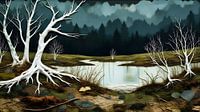 Moorlandschap bij nacht, bomen doemen schemerig op in de donkere lucht