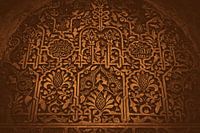 Een close-up van een stukje gesneden houtwerk in een van de paleizen van het Alhambra