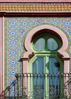 Foto detail van een mozaiek gevel in Elche - Spanje. Met moorse invloeden en ronde vormen. In pastel tinten.