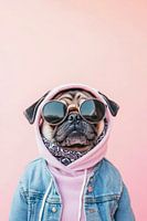 Een coole mopshond is op vakantie in de spotlights! Met een casual jasje met capuchon en een stijlvolle zonnebril straalt hij pure sereniteit uit. Zijn charmante gezicht en grote, ronde ogen nodigen je uit om te glimlachen, terwijl de pastelkleurige achtergrond de perfecte achtergrond vormt voor dit modebewuste huisdier. Een meesterwerk…