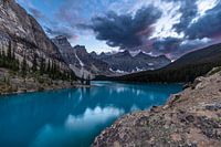 Het adembenemende Moraine Lake, een bergmeer in Banff National Park in de Canadese provincie Alberta, op 14 kilometer van het dorp Lake Louise. Het meer ligt in de Rocky Mountains, in de Valley of the Ten Peaks, op een hoogte van 1885 meter. Het heeft een oppervlakte van 50 hectare. Foto genomen bij zonsondergang, het gekende blauwe uur.