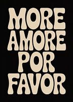 Dit typografische werk toont het opschrift "MORE AMORE POR FAVOR" in een opvallend, beige lettertype op een zwarte achtergrond. Het ontwerp maakt gebruik van een vet, afgerond lettertype met een charmant retro-karakter en een licht onregelmatige lijnvoering, die doet denken aan klassiek handlettering. Door de verticale plaatsing van de…
