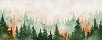 Dit aquarelkunstwerk vangt de zachte, maar vurige kleuren van de ochtendzon die door de nevelige bomen schijnt.