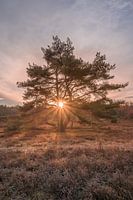 Een landschapsopname van een prachtige sfeervolle zonsopkomst op de Brunssummerheide. De zonnestralen breken mooi door de spar waardoor een fraaie sterzon met prachtige zonnestralen ontstaat. Het mooie morgenrood en de fraaie wolken zorgen voor een fraaie sfeer in de foto.