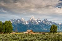 Mormon Row Barn met de Tetons op de achtergrond, Grand Teton National Park, Wyoming, USA
