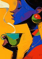 Morning Embrace - Dit kleurrijke schilderij toont twee abstract gestileerde gezichten die innig en teder bijna neuzen raken, met een stoompluim die uit een koffiekop oprijst tot tussen hun profielen.