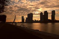 Zonsopkomst achter de skyline van Rotterdam welke zorgt voor een mooi silhouette van de gebouwen op de Kop van Zuid.