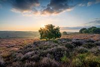 De opkomede zon op de Veluwe. De heide op de Posbank wordt prachtig verlicht door de opkomende zon