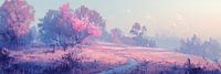 Morning Whisper Glow - Dit landschapsschilderij presenteert een glooiende plattelandsomgeving gehuld in pastelkleurige dageraad, waarin lichtroze en blauwtinten de serene vredigheid van het vroege ochtenduur accentueren.