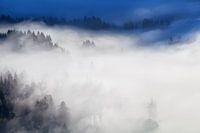 Dense fog covered alpine meadows in the morning. Bavaria, Germany
