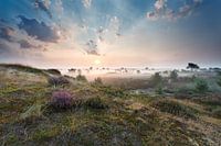 Beautiful misty sunrise over dunes with flowering heather. Drents-Friese wold, the Netherlands
